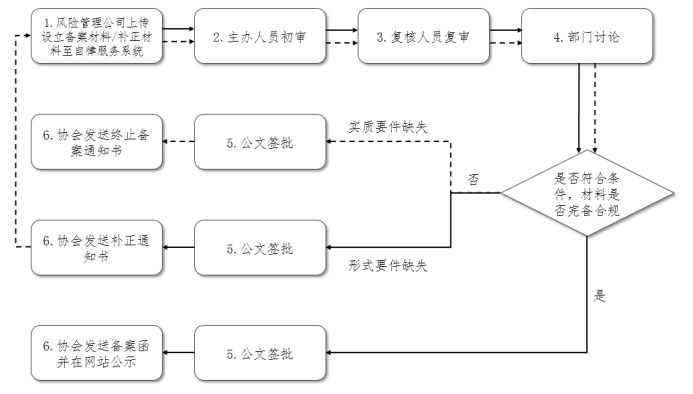 1.备案符合条件且材料完备、符合规定的,协会自受理材料之日起15个工作日内予以备案。由复审将备案结果在协会网站上公示,并向风险管理公司发送予以备案复函。