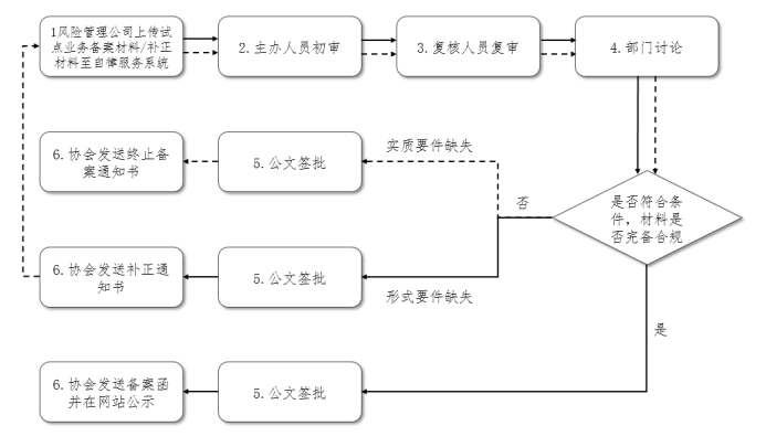 协会收到风险管理公司试点业务备案材料后,将根据《指引》及《材料规范》要求,对备案材料要件是否齐全、内容是否合规完备由主办人员进行审核,并将初审意见提交至复核人员。