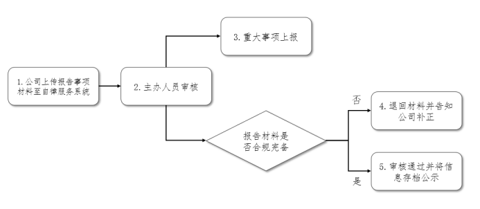 报告事项材料完备、符合规定审核通过的,主办人员需通知相关负责人更新存档文件,并定期进行信息公示;报告事项材料不完备或不符合规定需退回补正的,主办人员需及时联系公司反馈意见。