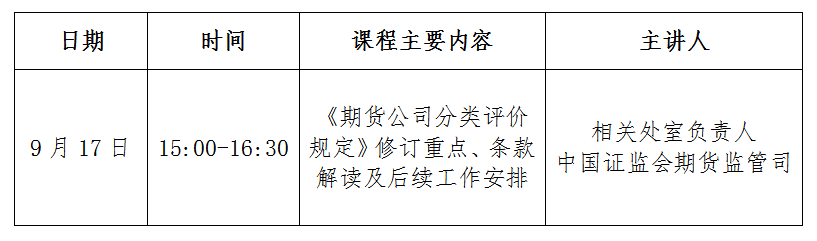 9月12日,证监会发布《期货公司分类评价规定》(以下简称《规定》)。为帮助证监会派出机构和期货公司全面准确理解《规定》内容,确保有序推进分类评价工作,协会将于9月17日举办《规定》解读直播培训。现将培训相关事项通知如下: