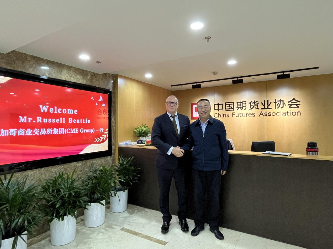 2024年4月15日,芝加哥商业交易所集团(CME Group)董事总经理兼亚太区负责人Russell Beattie一行到访协会,与协会杨光会长、吴亚军秘书长进行了交流会谈。