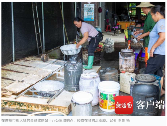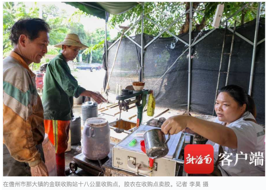 “每次我割完胶都会带着胶水来这里卖,不仅实惠,每公斤胶水还能多赚2角钱呢!”近日,在位于儋州市那大镇的金联收购站十八公里收购点,家住屋积村的胶农周发多在自家橡胶林里割完两桶胶水后,骑着电动车绕了两三公里路,到收购点去卖胶。