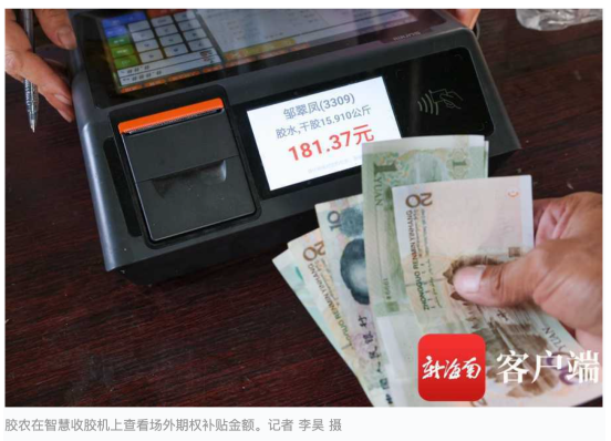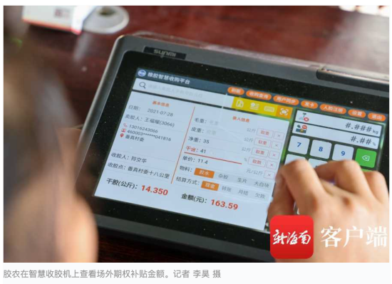 符英女告诉记者,这些数据都被实时记录在橡胶智慧收购平台,卖胶收入和补贴金额可通过该平台在网上结算,并直接打入银行卡中。目前,她已和丈夫获得了500余元的场外期权补贴。