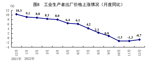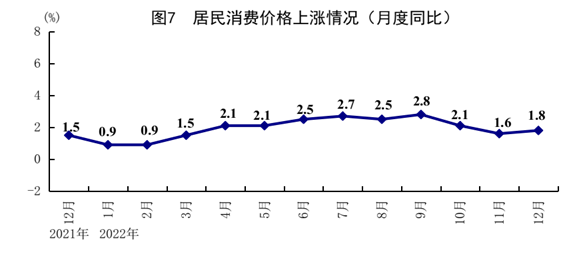 全年居民消费价格(CPI)比上年上涨2.0%。分类别看,食品烟酒价格上涨2.4%,衣着价格上涨0.5%,居住价格上涨0.7%,生活用品及服务价格上涨1.2%,交通通信价格上涨5.2%,教育文化娱乐价格上涨1.8%,医疗保健价格上涨0.6%,其他用品及服务价格上涨1.6%。在食品烟酒价格中,猪肉价格下降6.8%,粮食价格上涨2.8%,鲜菜价格上涨2.8%,鲜果价格上涨12.9%。扣除食品和能源价格后的核心CPI上涨0.9%。12月份,居民消费价格同比上涨1.8%,环比持平。全年工业生产者出厂价格比上年上涨4.1%;12月份同比下降0.7%,环比下降0.5%。全年工业生产者购进价格比上年上涨6.1%;12月份同比上涨0.3%,环比下降0.4%。